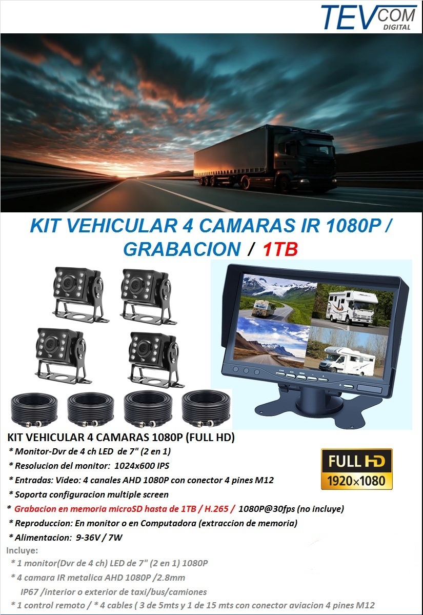 KIT VEHICULAR / MONITOR-DVR / 4 CAMARAS IR 1080P / GRABACION 1TB